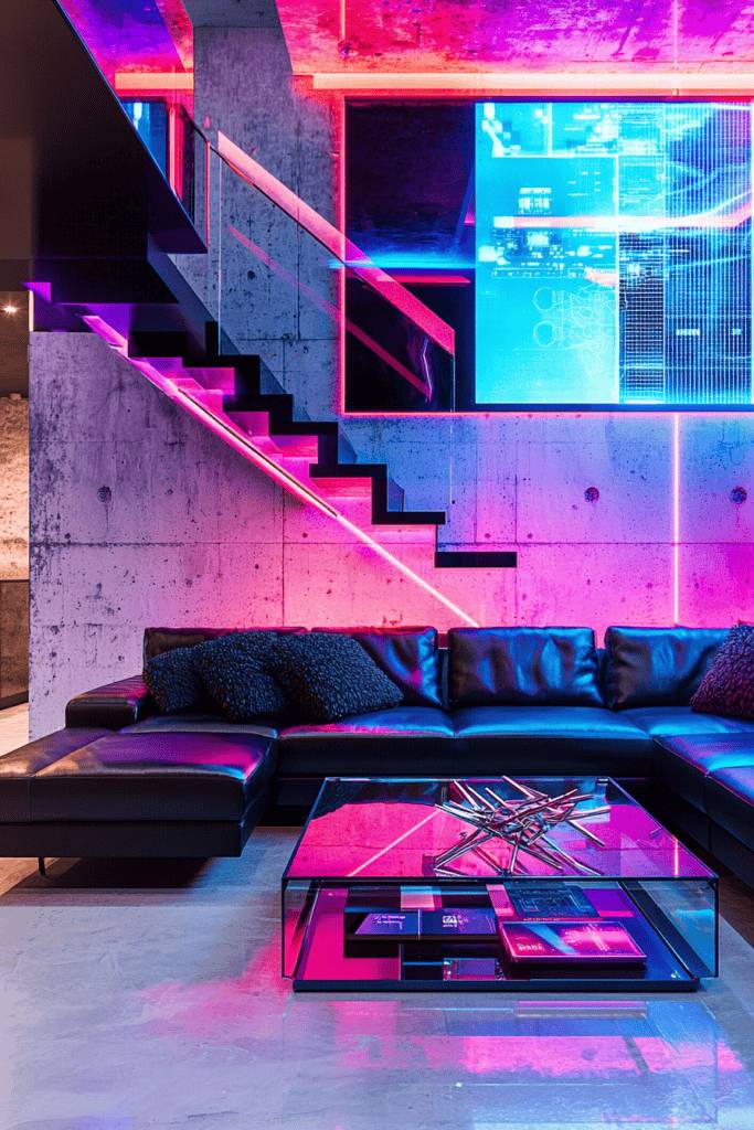 This urban loft living room shines with futuristic style, embracing electrifying neon lighting that transforms the space into a modern masterpiece. Vibrant pink, purple, and blue light bars line the concrete staircase and walls, creating a sense of energy and movement. The sleek black leather sectional provides a minimalist backdrop for the dynamic color scheme, while textured pillows add an element of comfort.