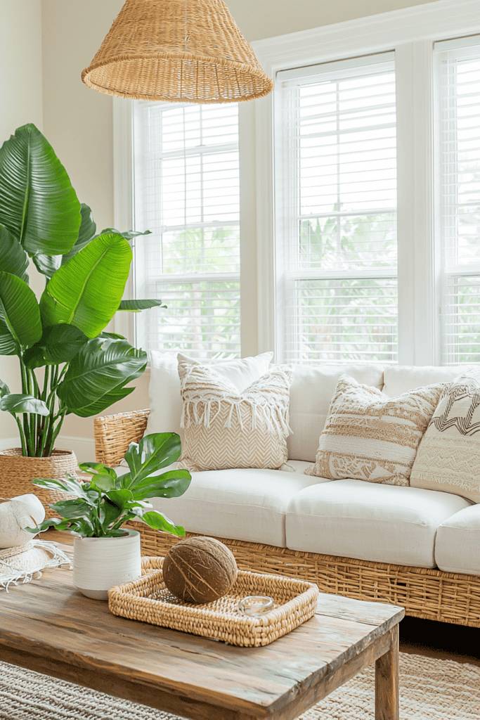 This tropical-inspired living room exudes bohemian charm with its wicker elements and lush greenery. The white sofa is adorned with textured throw pillows in soft beige and cream patterns, creating a relaxed yet cohesive look. A rustic wooden coffee table provides the perfect platform for a woven tray filled with natural accents like coconuts and candles. Towering plants in wicker planters bring the outside in, effortlessly evoking a breezy, tropical feel.