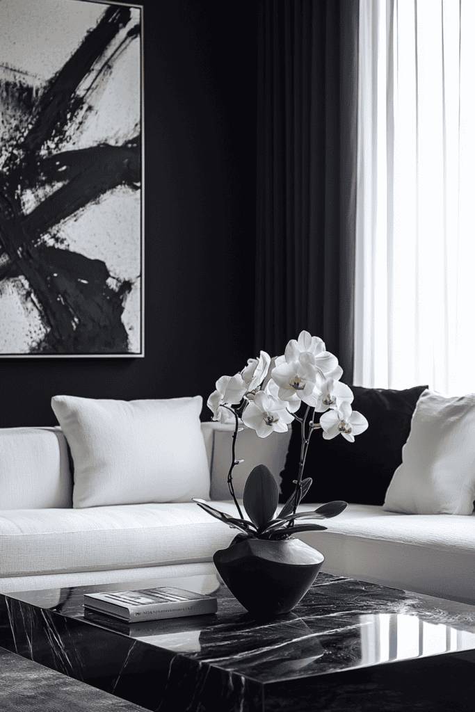 A vase of delicate white orchids atop the coffee table adds a touch of organic elegance, softening the space’s angular lines. Black curtains frame the windows, lending depth to the room while letting natural light filter in to balance the darker tones. The clean lines and simplicity of this design make it the perfect space for those who appreciate contemporary elegance and bold contrasts.