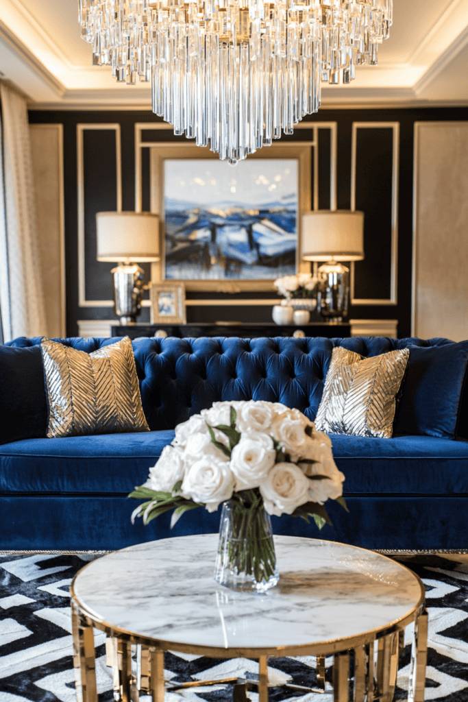 This luxurious living room radiates opulence with its bold navy-blue tufted sofa and gleaming gold accents. The shimmering metallic throw pillows enhance the rich velvet texture of the sofa, creating a seating area that feels both regal and inviting. The marble and gold coffee table adds a sleek, polished centerpiece to the room, adorned with a bouquet of pristine white roses for timeless elegance.