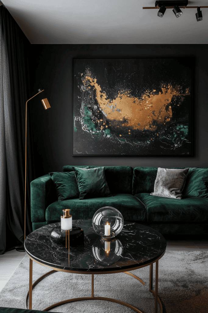 Rich, deep hues of emerald green establish a mood of sophisticated luxury in this living room. The velvet sectional invites relaxation, offering a lush texture that is complemented by the gold accents in the lighting and decor. The black marble coffee table with gold legs provides a dramatic centerpiece, topped with modern accessories like a glass orb candleholder that amplifies the room’s artistic vibe.