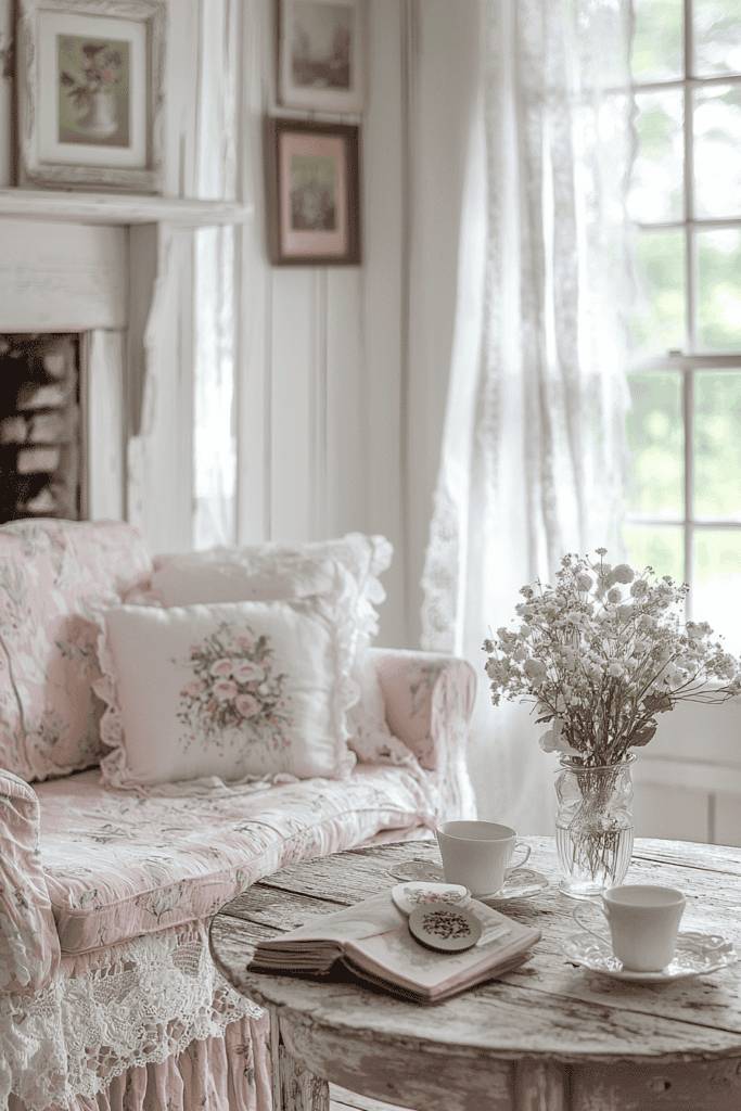 Light filters through sheer lace curtains, filling the space with a soft glow that enhances its ethereal atmosphere. Framed vintage botanical prints on the walls and a well-loved book on the table add personal touches that feel lived-in and warm. This room beautifully captures the essence of shabby chic, blending weathered elegance with a cozy, nostalgic feel.