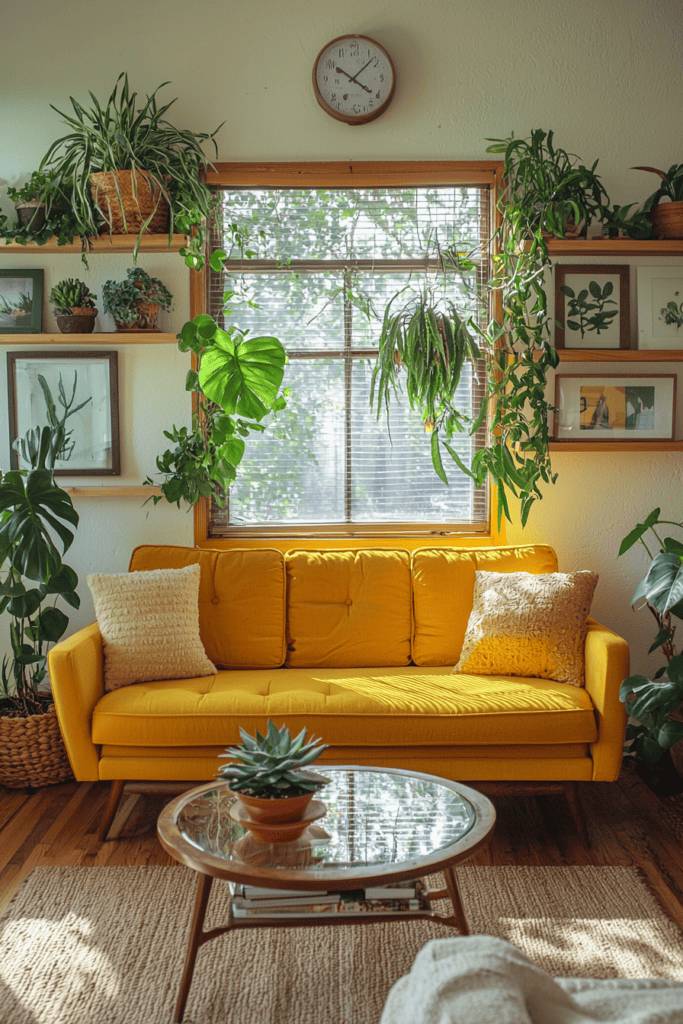 This lively living room bursts with natural energy, thanks to its abundance of greenery. Potted plants in varying sizes and textures surround the space, with hanging vines framing the window to create the feel of an indoor garden. The vibrant yellow mid-century modern sofa contrasts beautifully with the verdant green foliage, acting as a cheerful centerpiece that radiates warmth. Above the sofa, wooden shelves are adorned with plants and botanical art, adding layers of depth and personality to the room.