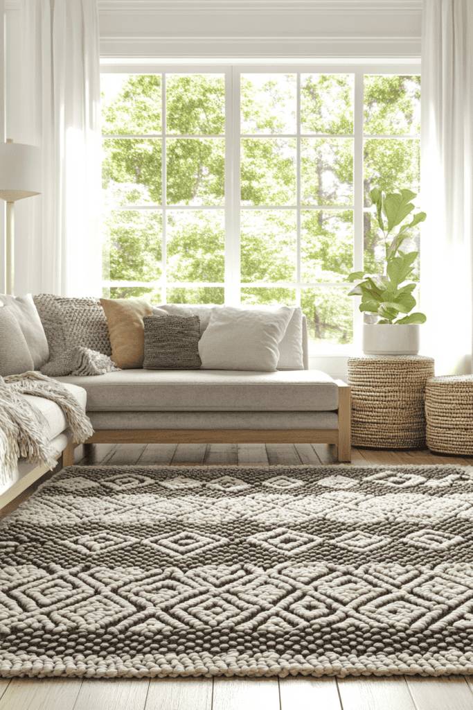 In minimalist living rooms, rugs should add texture and warmth without overpowering the space. Choose neutral-toned rugs with simple, geometric patterns or flatweave designs to complement the room’s sleek aesthetic. A well-placed rug can also define different areas of an open-plan room, creating a cozy, grounded atmosphere. Keep the rug size proportional to the furniture layout to maintain balance and harmony within the space.