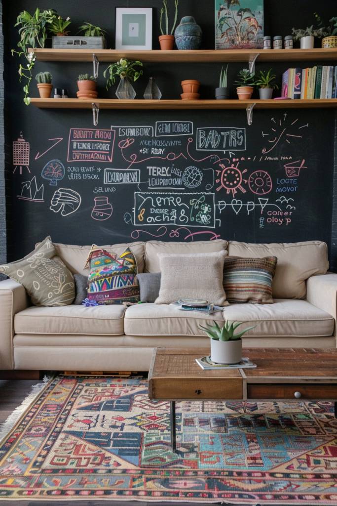 You can frame the chalkboard for a polished look or leave it bare for a more casual vibe. Use vibrant chalk colors to add pops of brightness, or stick to classic white for an elegant touch. This creative outlet is perfect for families, artists, or anyone wanting to add a unique flair to their living room. Embrace the spontaneity and let your walls come alive!