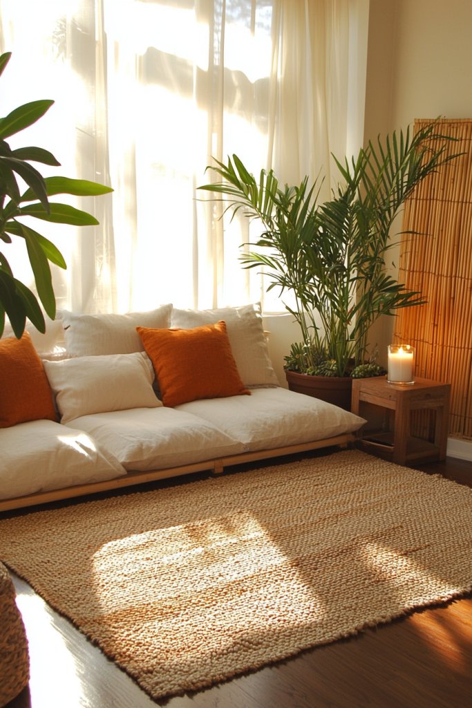 Add a plush cushion or a simple meditation mat to invite comfort. Surround yourself with calming elements, like soft throws, an indoor plant, or a small water feature, to enhance tranquility.