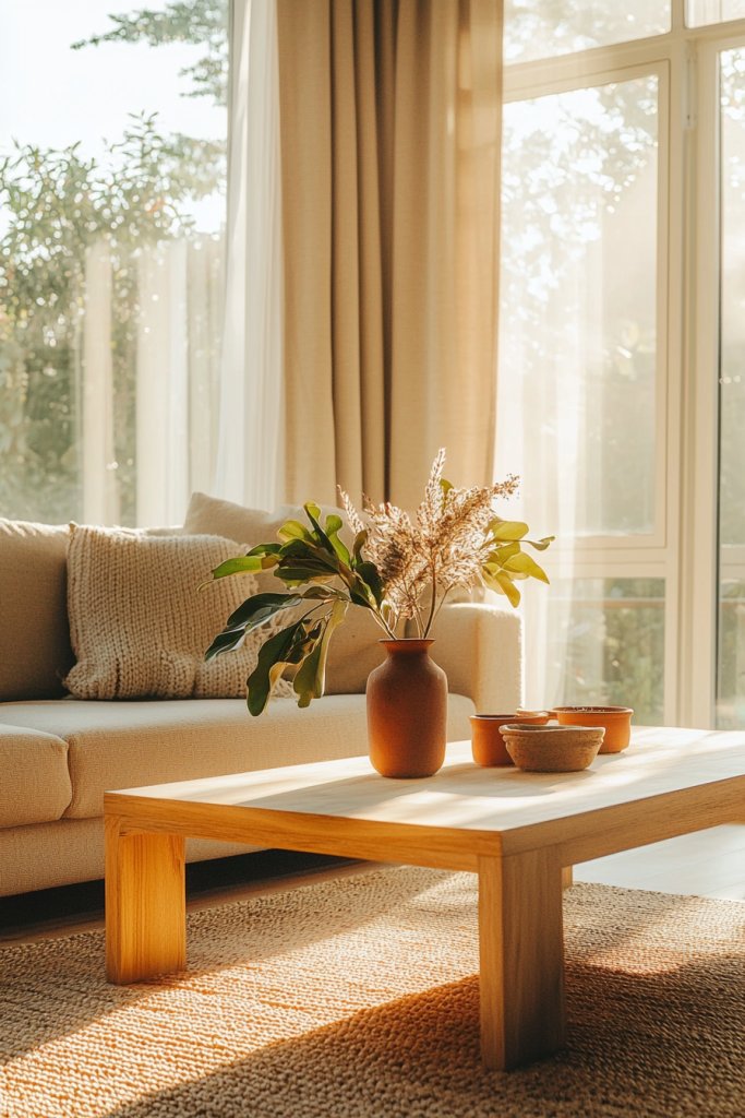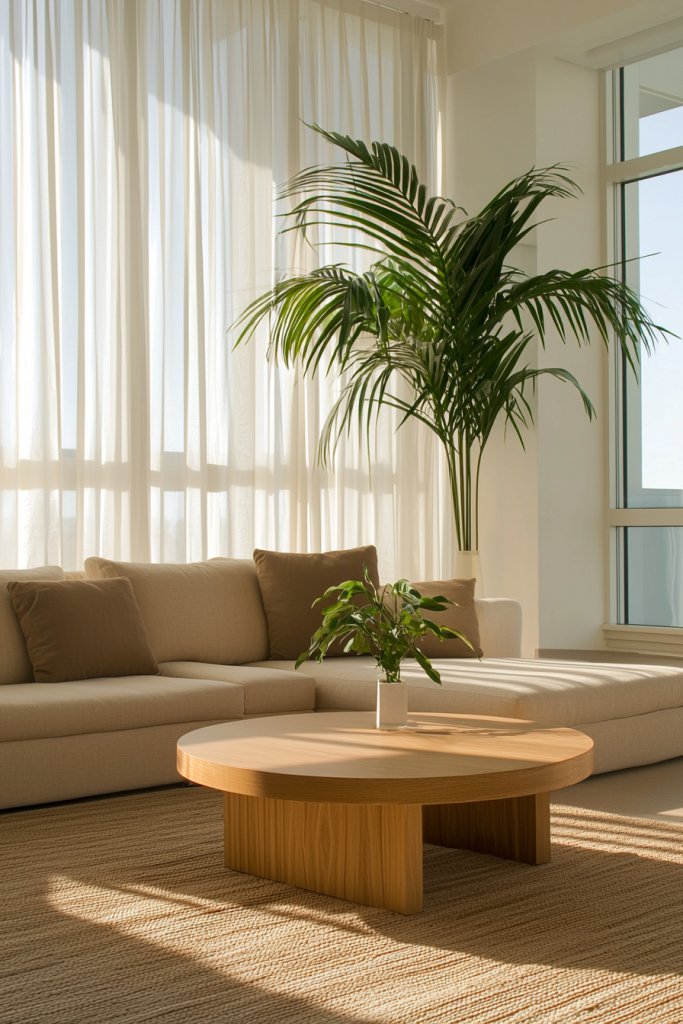 Finally, let light in! Use sheer curtains to invite sunlight, enhancing the airy feel. This minimalist approach not only elevates your living room’s aesthetic but also cultivates a nurturing sanctuary for your mind and spirit to flourish.