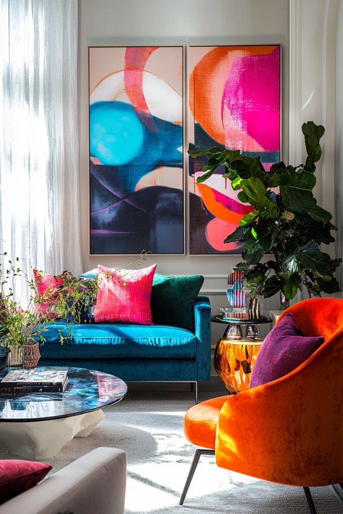 • Incorporate statement art pieces in bold colors to create captivating focal points that enhance personality and ambiance in your living room.