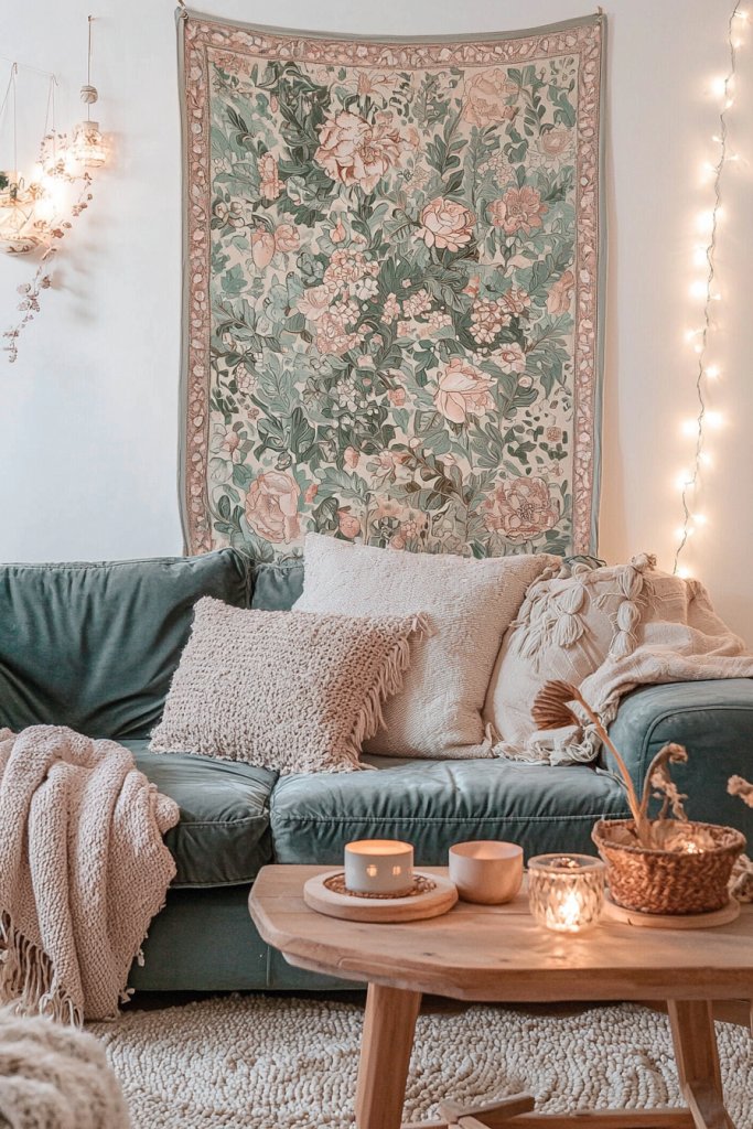 Whether you opt for vibrant colors or muted tones, tapestries can transform your living room into a sanctuary of comfort and charm. Embrace this trend to bring a soft, artistic essence into your home, enhancing both aesthetic and ambiance.
