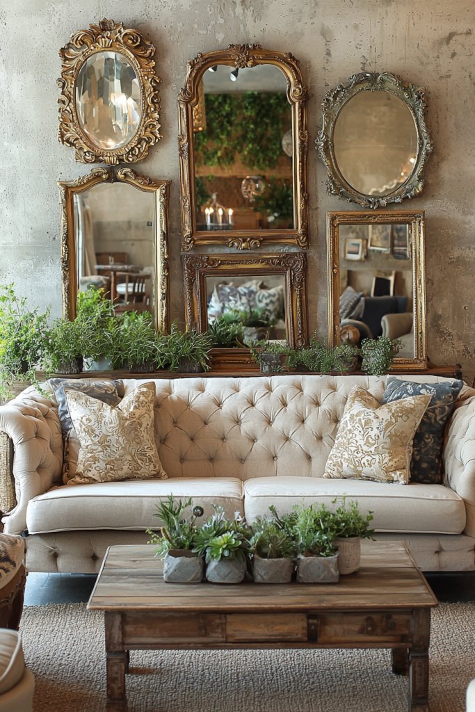 Art ledges offer a fantastic way to curate your space, but vintage mirrors with frames add an entirely different dimension to your living room decor. These mirrors not only reflect light, making your room feel brighter and more spacious, but they also serve as striking focal points.