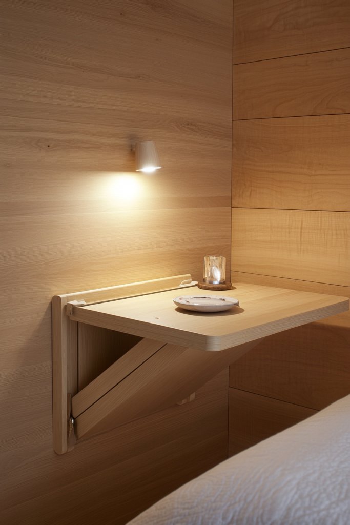 Imagine a slim, floating shelf mounted beside your bed, holding a small lamp, a book, and a cup of tea. When not in use, it folds down or slides away, leaving the room feeling open and airy. The minimalist design emphasizes clean lines and unobstructed space. It’s a modern, practical solution that adds a touch of DIY charm.