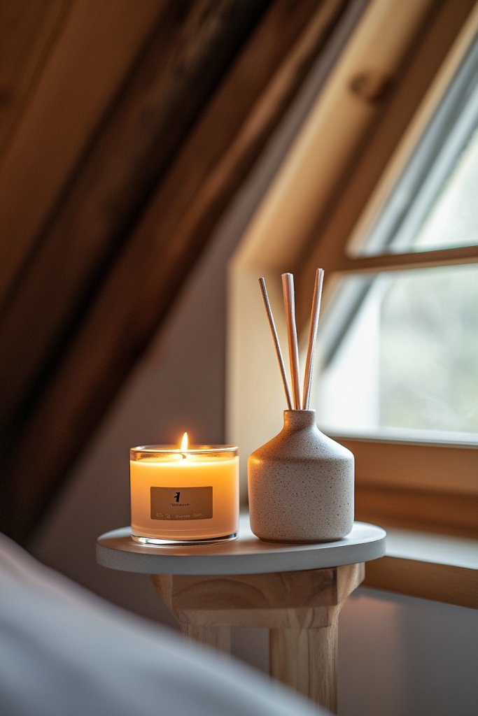Picture a softly glowing candle on your nightstand, releasing a gentle aroma of lavender or vanilla. Nearby, a sleek diffuser disperses essential oils into the air, filling your space with calming notes. The combination of warm light and fragrant scents makes your loft feel inviting and peaceful. The visuals of flickering flames and elegant bottles add to the aesthetic.