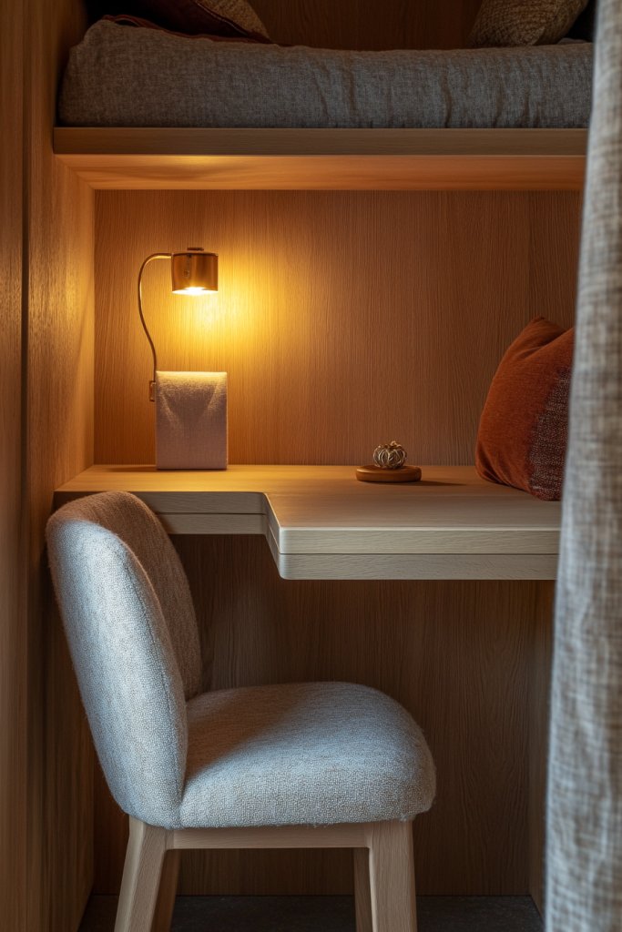 14. Compact Desk Area with Warm Lighting for Work & Leisure