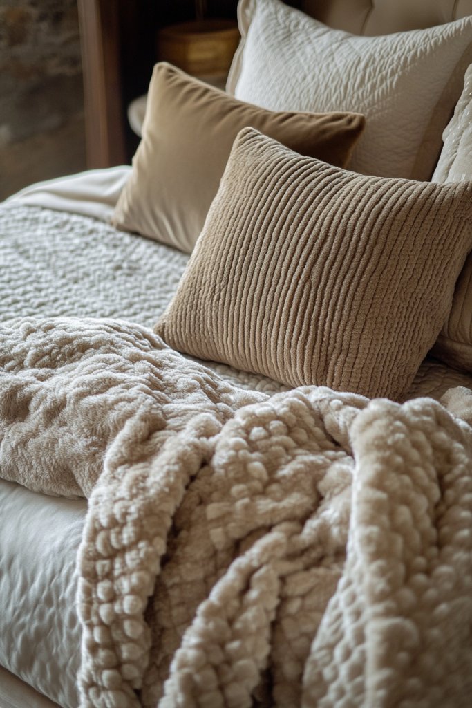 Imagine a bed dressed in crisp, neutral sheets topped with a plush duvet in warm beige or soft gray. Toss on a variety of textured throws—think chunky knits, faux fur, or woven fabrics—that add tactile richness and visual depth. Pile on an assortment of pillows in different shapes and fabrics, creating a boutique hotel vibe that screams comfort. The overall look is inviting, cozy, and effortlessly stylish.