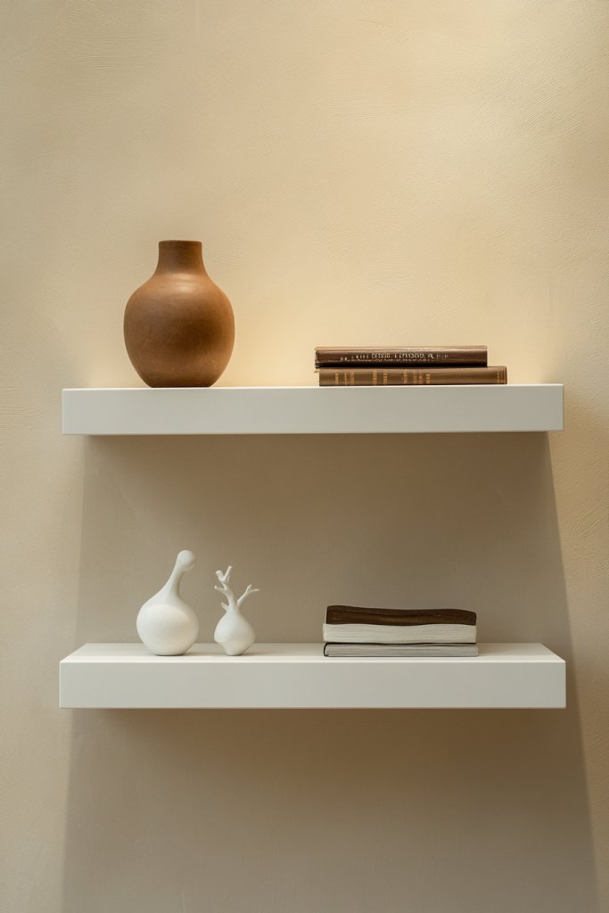 Imagine sleek, white or dark wood floating shelves mounted on a wall, displaying a curated collection of books, decorative boxes, or personal mementos. The minimalist design draws the eye upward, making the room appear taller and more spacious. When styled with care, shelves become a showcase for your personality—think small sculptures, framed quotes, or favorite keepsakes.