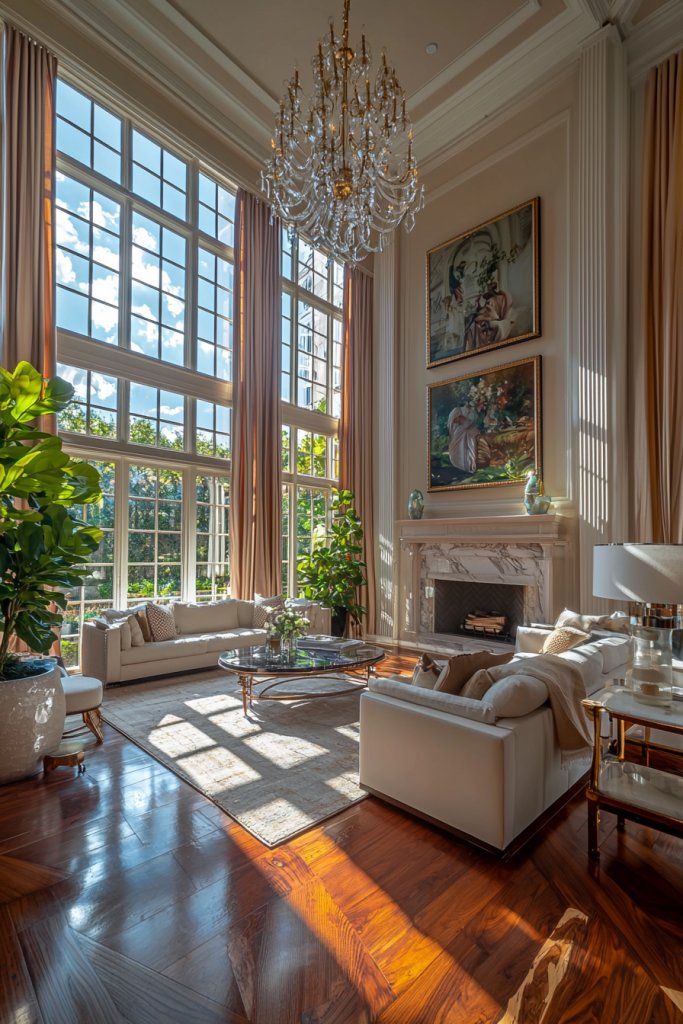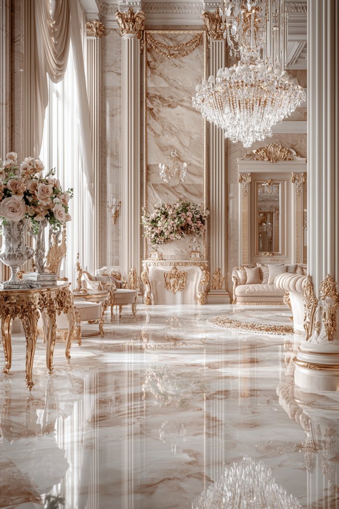 Each facet of the chandelier reflects elegance, setting the tone for the exquisite design elements that follow. High ceilings and intricate moldings create an atmosphere of sophistication, while a polished marble floor adds a touch of grandeur beneath your feet.