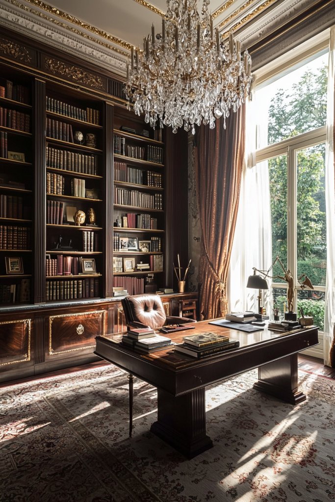 Add unique architectural details, like coffered ceilings or crown moldings, to elevate the aesthetic further. Personal touches, such as a custom ladder to reach those coveted top shelves or an ornate fireplace, can transform your library into a sanctuary of tranquility. In this elegant home library, every detail reflects your style, making it a true haven for relaxation and inspiration.