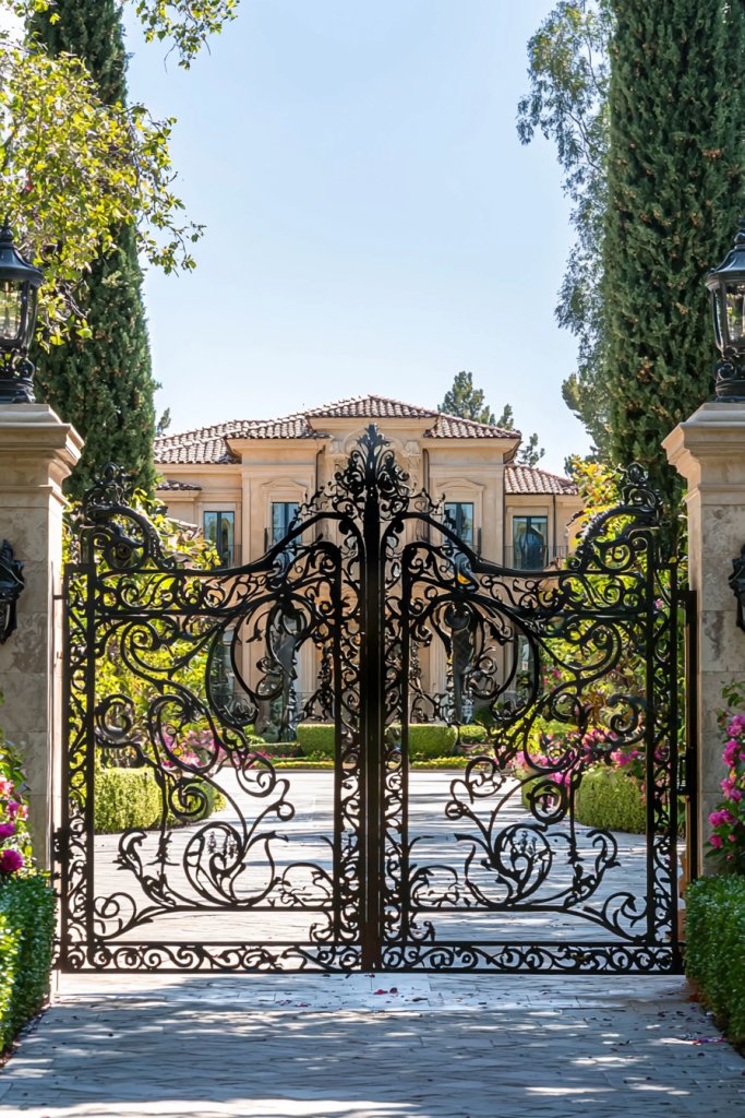 Imagine a grand wrought-iron gate adorned with intricate designs, standing tall and welcoming. Its automatic opening mechanism guarantees convenience, while high-tech surveillance cameras discreetly monitor your property, providing peace of mind.