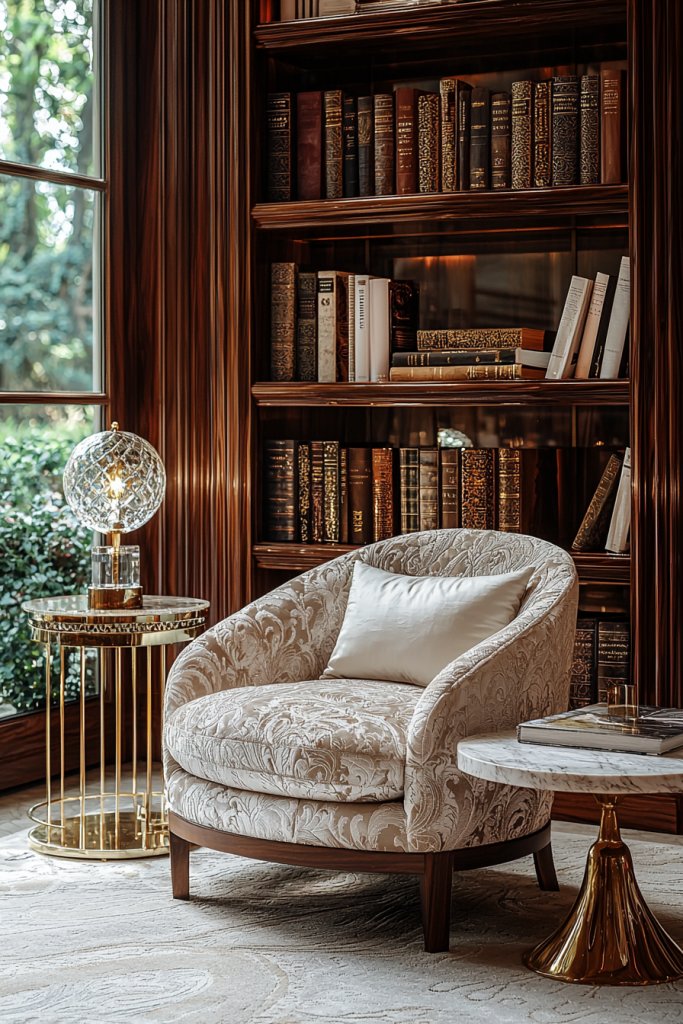 Soft, ambient lighting enhances the inviting atmosphere, while rich textiles like velvets and wools envelop you in comfort. Decorate your nook with tasteful bookshelves, filled with your favorite reads, and add a small side table for convenience.