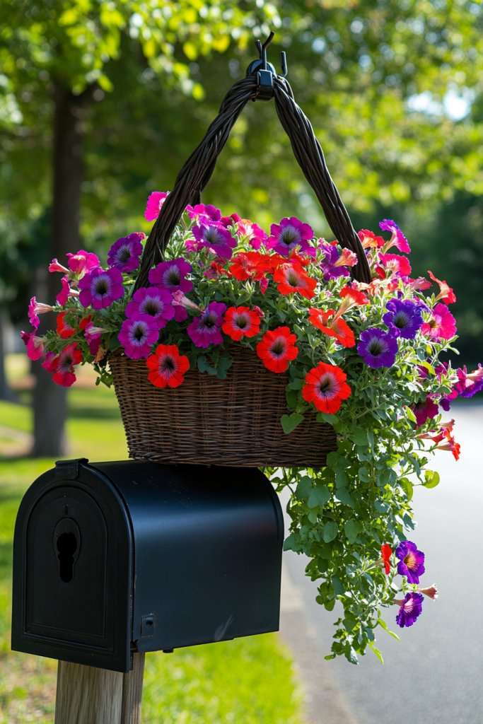 Imagine a weatherproof planter filled with cascading petunias, succulents, or seasonal blooms hanging from a decorative hook on your mailbox post. The lush greenery and colorful flowers create a lively, inviting scene. The contrast of the planter’s material—metal, ceramic, or woven basket—adds texture and interest. It’s a small detail that makes a big difference.