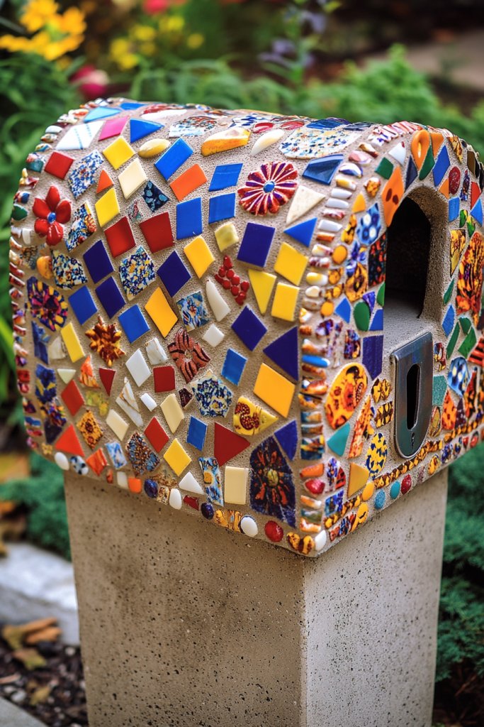 Imagine a colorful mosaic of weatherproof tiles arranged in intricate patterns or images, adorning the base or sides of your mailbox post. The textured surface and vibrant colors add depth and personality. It’s like a miniature outdoor masterpiece that reflects your artistic flair and love for detail. The mosaic catches sunlight and glows in the evening.