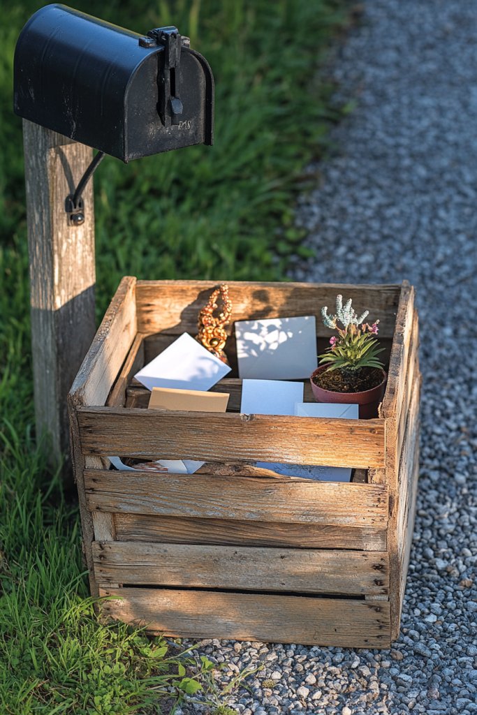Tired of cluttered mail piling up or losing small items? Adding a wooden crate or mini shelf near your mailbox creates a designated spot for mail, keys, or decor. It’s a practical solution that also adds rustic charm to your entryway. Who says storage can’t be stylish?