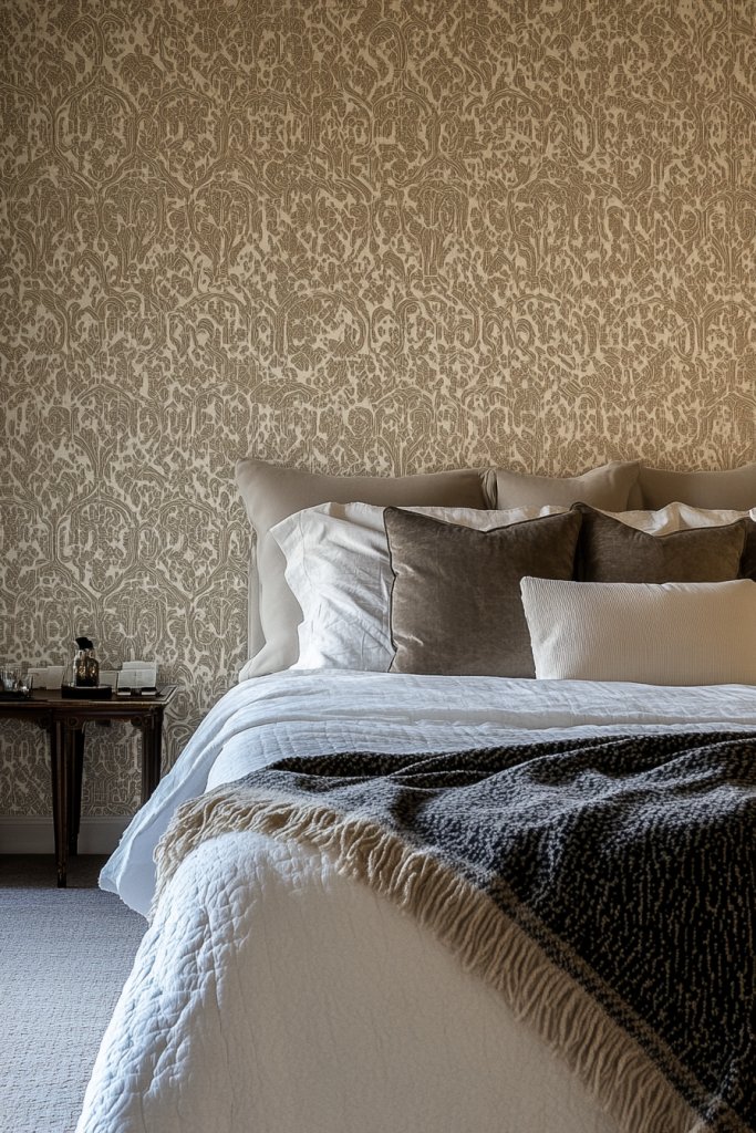 Imagine walking into a bedroom where one wall boasts a rich, tactile wallpaper with a raised geometric pattern or a subtle metallic sheen. The play of light and shadow creates depth, making the room feel layered and inviting. Soft lighting enhances the texture, highlighting the intricate details and adding warmth. The overall effect is a space that feels thoughtfully designed and visually captivating.