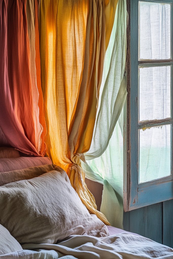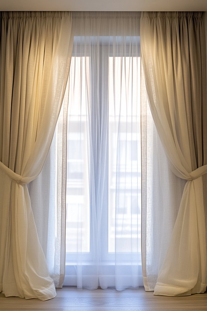 Picture sheer, flowing curtains in a delicate fabric like linen or voile, gently framing your windows. They diffuse natural light, creating a dreamy glow that fills the room. Layered with heavier drapes in a coordinating color or texture, you control privacy and light with ease. The fabric’s softness adds a touch of romance and serenity, making your space feel calm and inviting.