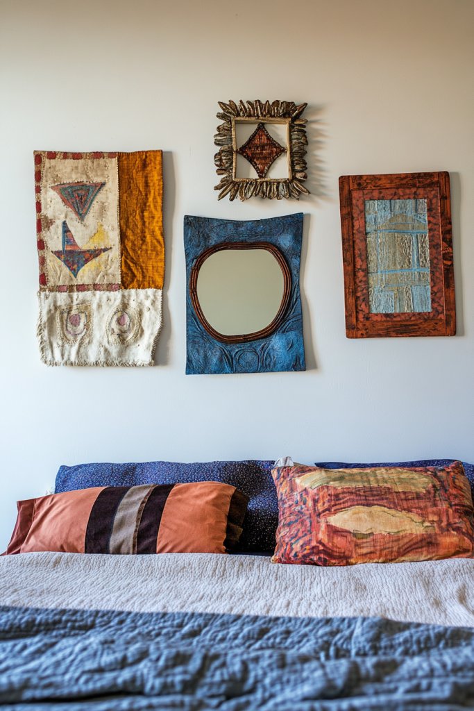 Picture a large, abstract wall art piece with bold colors or textured fabric panels arranged in a gallery style. Alternatively, a decorative mirror with an ornate frame reflects light and enlarges the room visually. Combining these elements creates a layered, curated look that draws the eye and adds depth. The mirror also enhances natural light and makes your space appear larger.