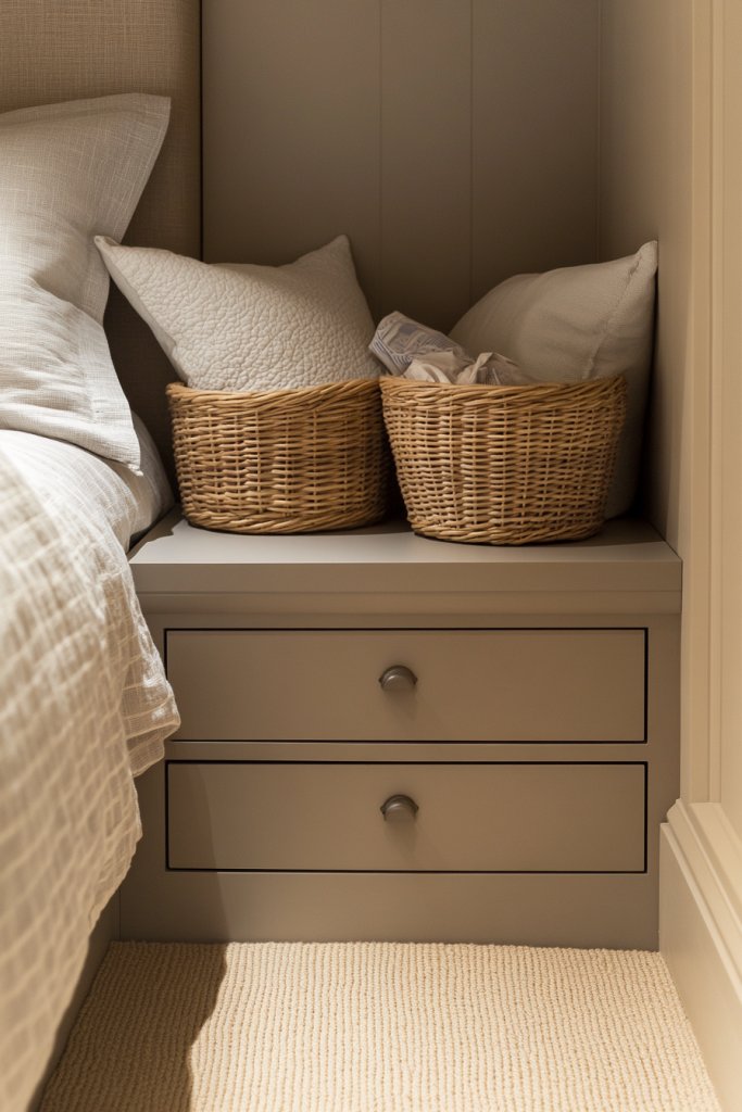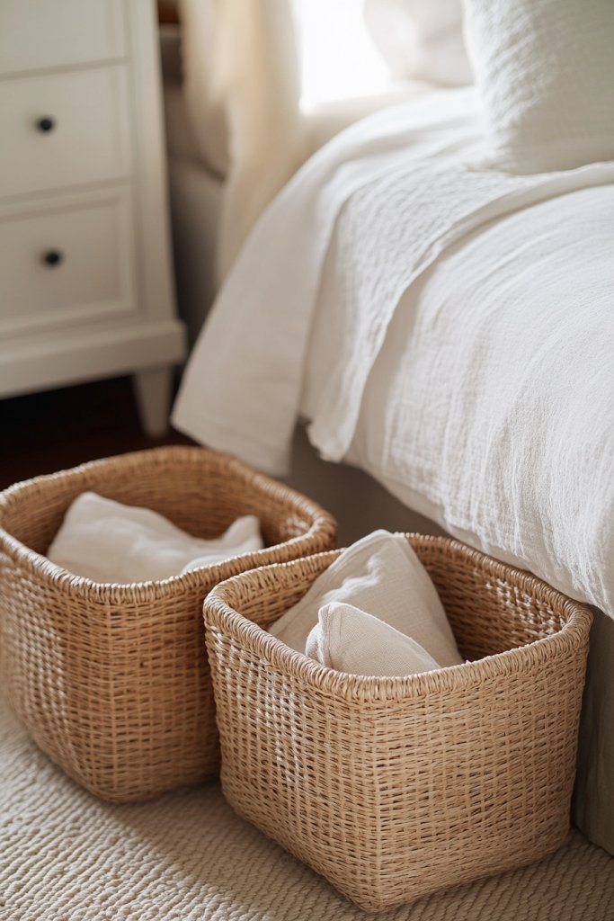 Imagine a collection of woven baskets in natural tones neatly stacked at the foot of your bed or tucked under a sleek bench. Their textures add warmth, contrasting beautifully with smooth bedding and soft rugs. The baskets are not just functional—they serve as decorative accents, breaking up open space with their earthy charm. When you open one, you find a treasure trove of neatly folded linens or accessories, ready to keep your space looking pristine.