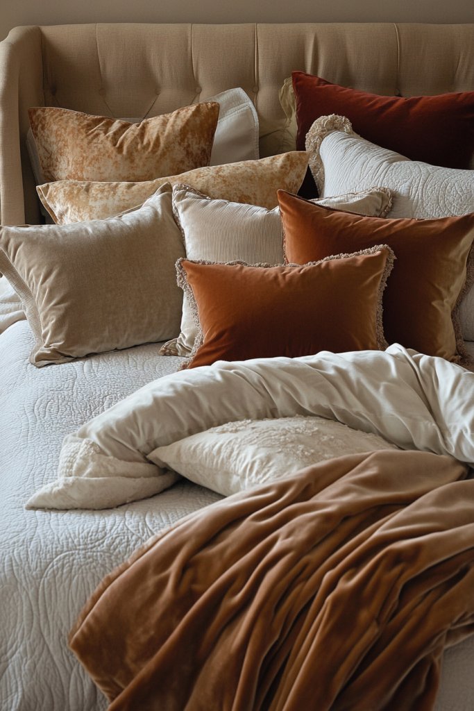 Picture a bed draped in crisp, white sheets topped with a plush duvet in a muted tone. Add an assortment of decorative pillows in different sizes, fabrics, and textures—think velvet, silk, and woven textiles. A chunky knit throw blanket casually tossed at the foot of the bed adds a tactile element. The mix of textures and layers creates a visual feast that looks inviting and luxurious.
