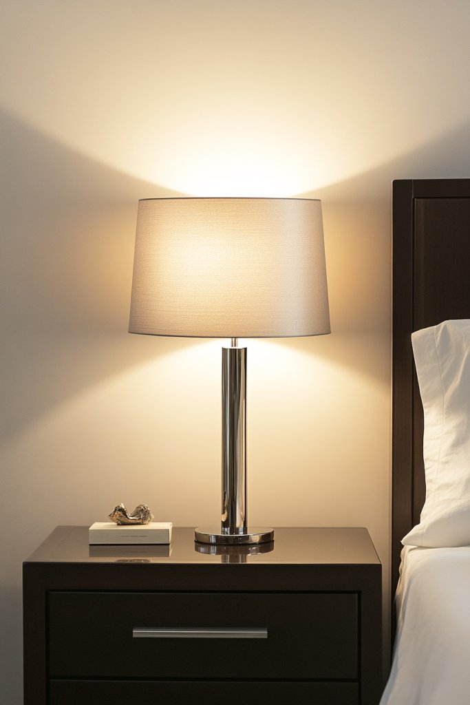Imagine a sleek, floating nightstand with a single, sculptural lamp casting a warm glow. The lamp features a bold, modern design—perhaps a geometric base or a matte finish—that acts as a focal point. Keep the surface clear with only a few essential personal items, like a small clock or a favorite book. The overall effect is a serene, clutter-free zone that exudes modern elegance.