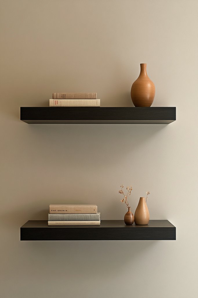 Picture a set of slim, matte-finish floating shelves mounted on a wall painted in a soft hue. They hold a curated collection of books, small sculptures, or personal mementos—without the bulk of traditional furniture. The clean lines and open structure make the room feel more expansive and organized. Soft lighting installed underneath or along the shelves adds a subtle glow, highlighting your display.