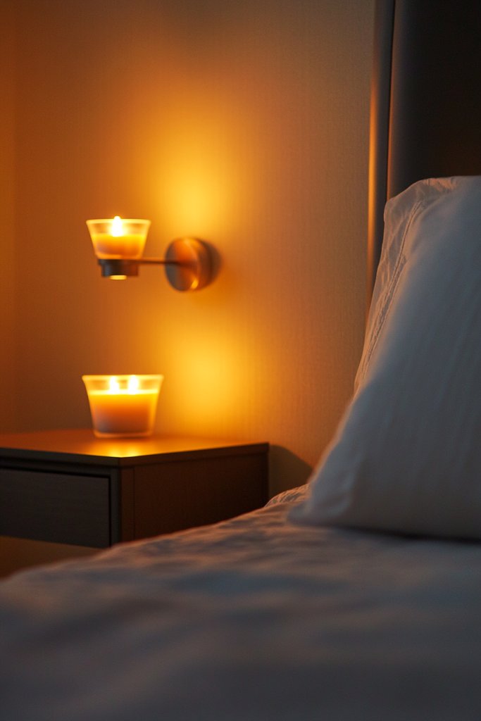 Imagine soft, glowing light from a wall-mounted dimmable sconce or a sleek fixture that casts a gentle halo around the room. Add in flickering candles on a decorative tray or holder—without the risk of wax drips or open flames—using flameless LED candles for safety. The layered lighting creates depth and warmth, making your bedroom feel like a luxurious retreat. You can adjust brightness easily, setting the perfect mood for winding down or reading.