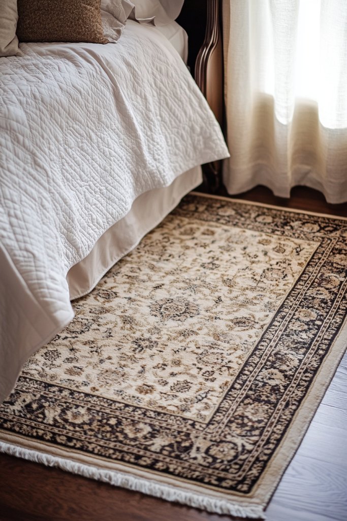 Visualize a large, plush rug with a subtle geometric or floral pattern lying beneath your bed, extending beyond the edges. The soft pile adds texture and comfort, especially on hardwood or tile floors. The pattern and color tie together your furniture and decor, creating a cohesive look. When paired with layered bedding and soft lighting, the rug anchors the space beautifully.