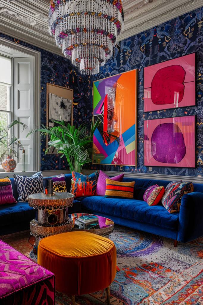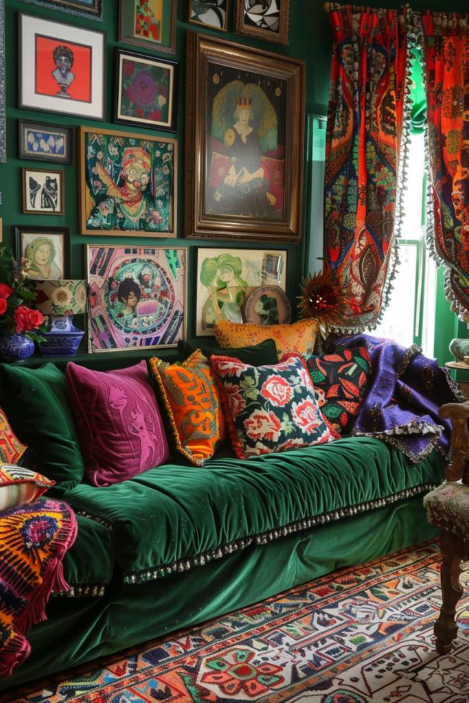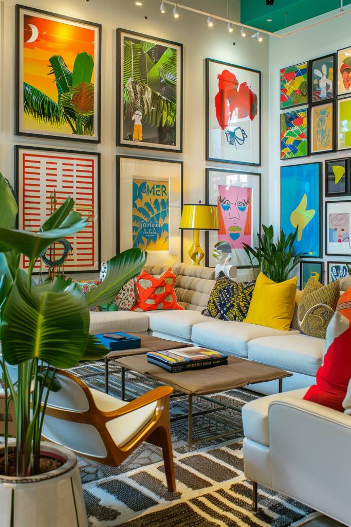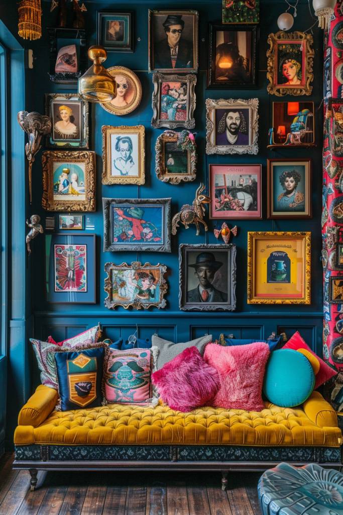 Maximalism doesn’t stop at bold colors; it extends to how you display art in your space. An eclectic gallery wall is your canvas, a curated collection that tells your story. Start by mixing various frame styles—think vintage wood, sleek metal, and colorful acrylics. This contrast adds depth and visual interest.