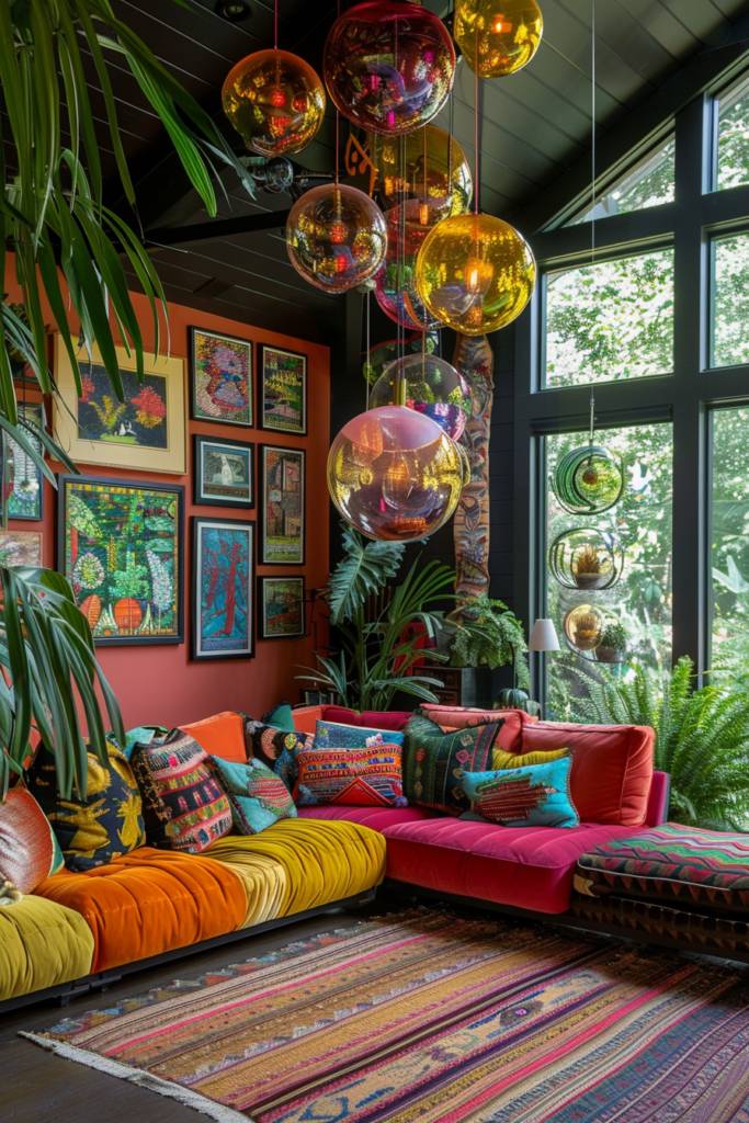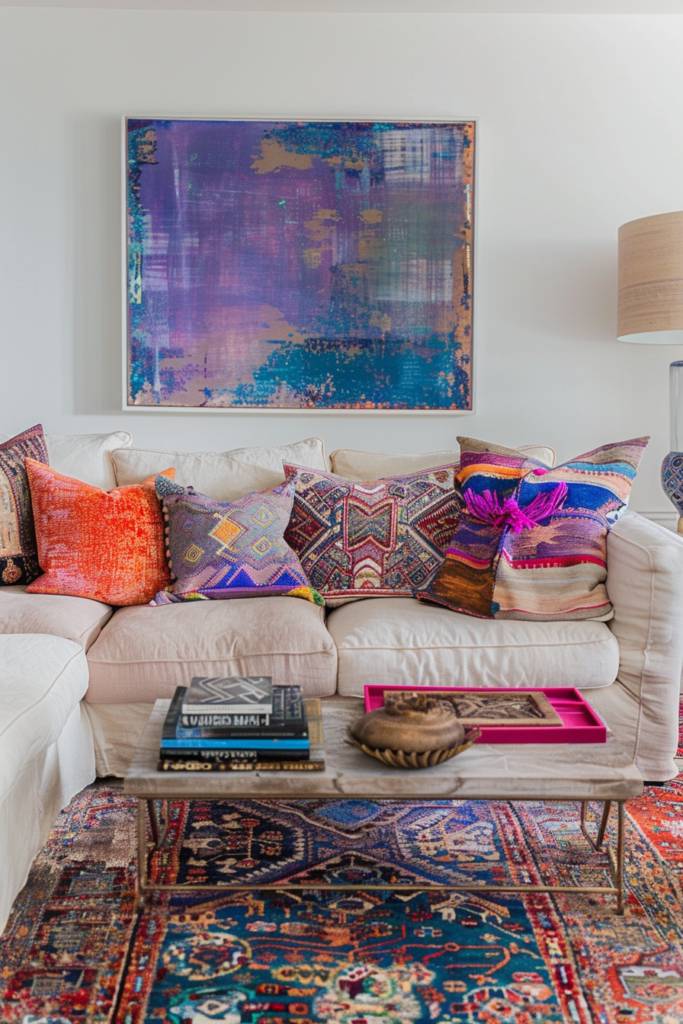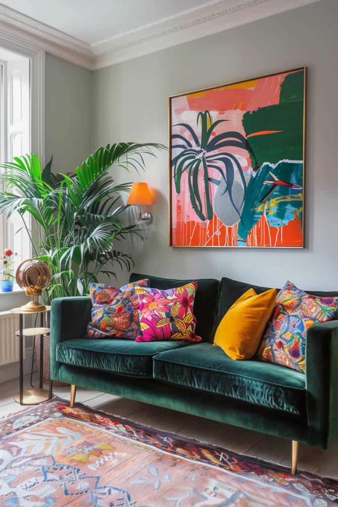 Consider bold planters filled with lush greenery or striking flowers, bringing life and color to every corner. Hang a statement piece, like a large, vibrant wall art or a macramé hanging planter, to create a focal point that draws the eye.