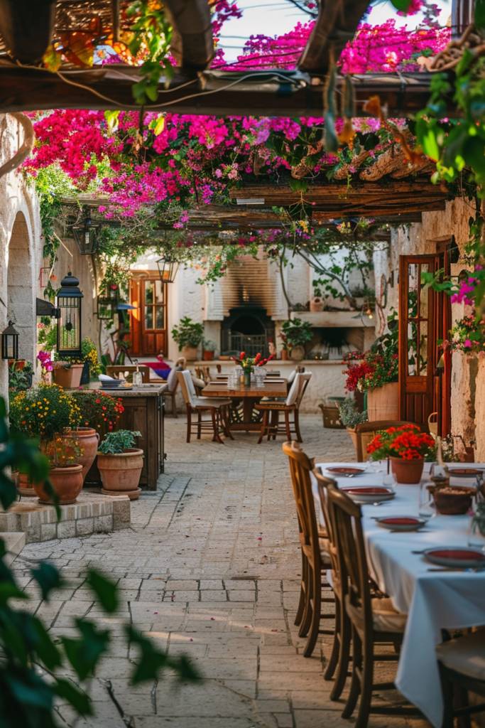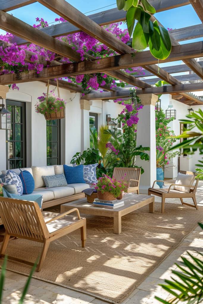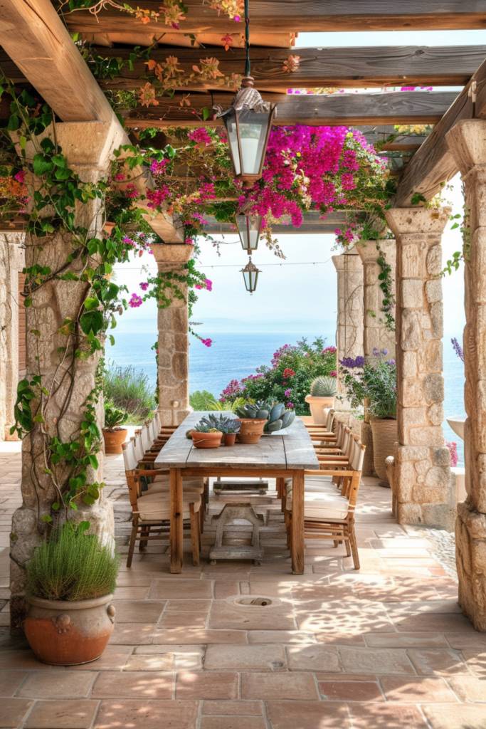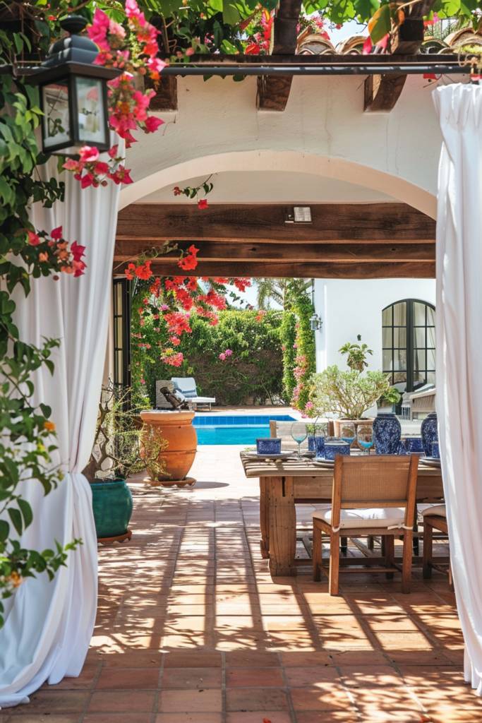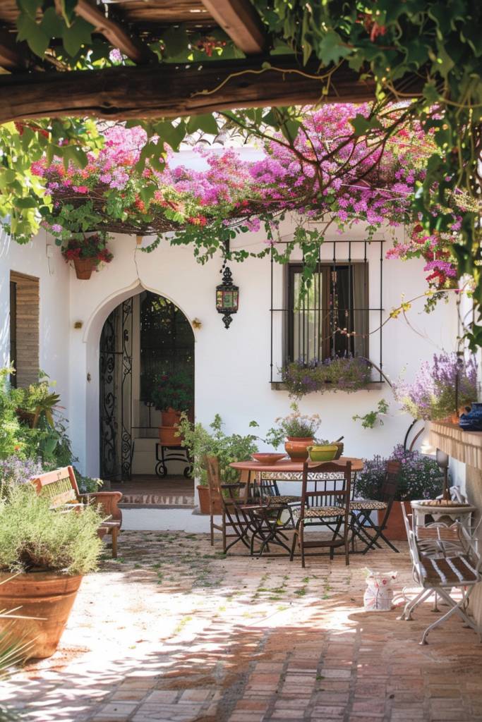 Incorporate a weathered wooden table for al fresco dining, adorned with bright tableware and flickering candles. Think about a shaded pergola draped with climbing vines or vibrant bougainvillea to create a cozy ambiance.