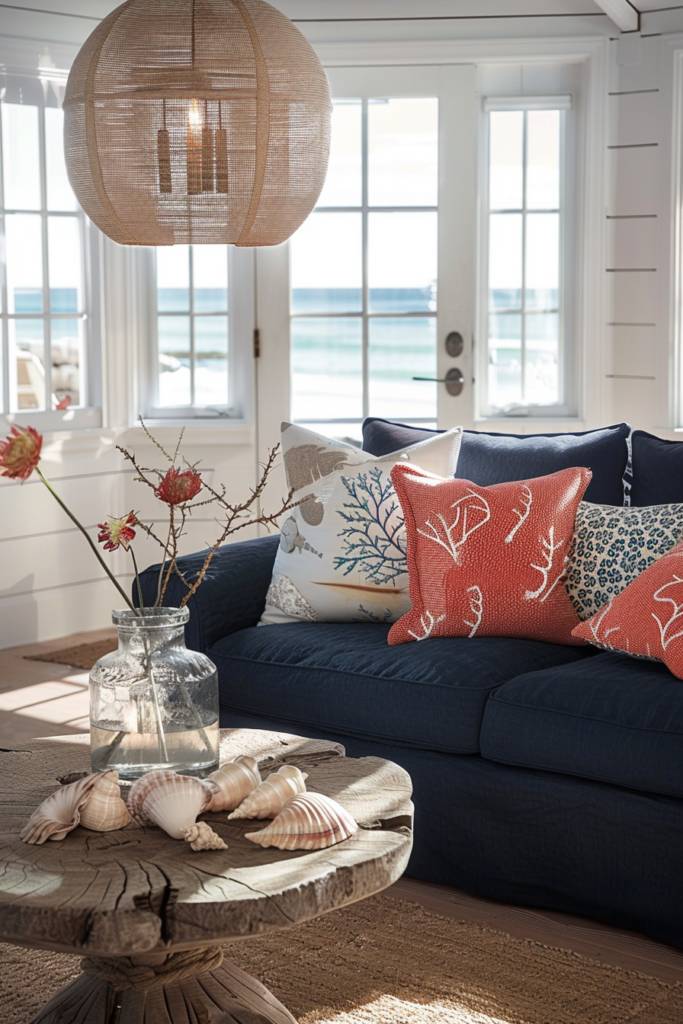 Don’t shy away from bold choices; a deep navy accent wall can serve as a striking backdrop for lighter furnishings. You might also explore natural materials, like ceramic pottery in ocean hues, to bridge the gap between indoor and outdoor living.