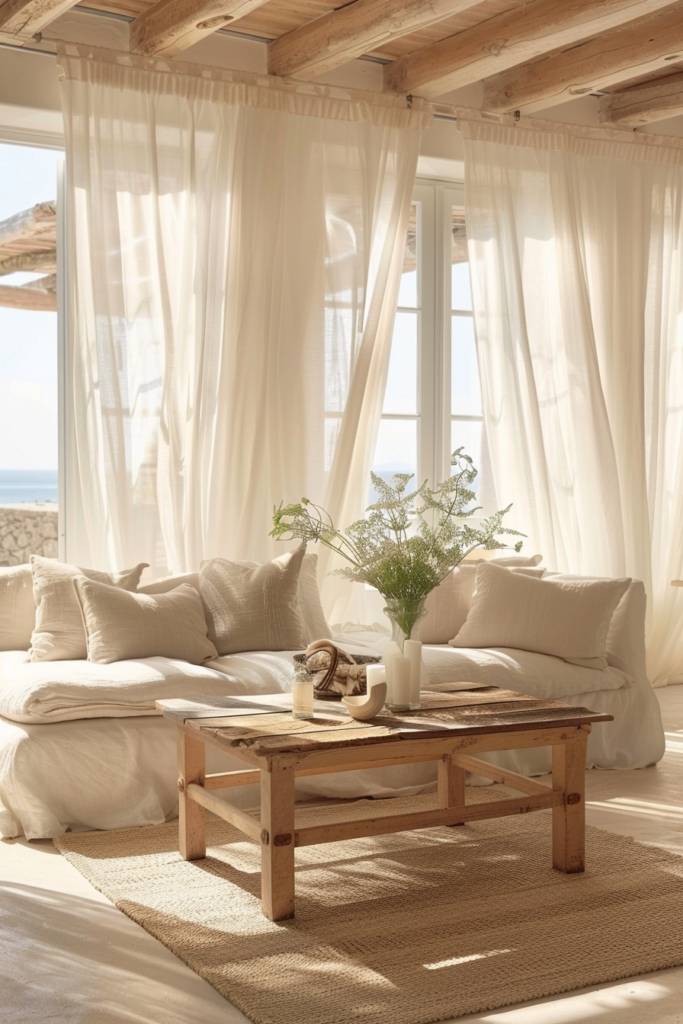 Don’t shy away from incorporating textures, like ruffled edges or subtle embroidery, to add depth without overwhelming your space. By embracing these light fabrics, you’ll not only create a serene ambiance but also bring the essence of the Mediterranean right into your home.
