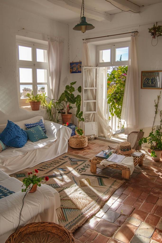 Enhance the atmosphere with natural elements—think potted olive trees or terracotta planters bursting with vibrant greenery. A statement mirror with a distressed frame can reflect light and create an illusion of space, while a simple yet elegant light fixture adds a touch of charm.