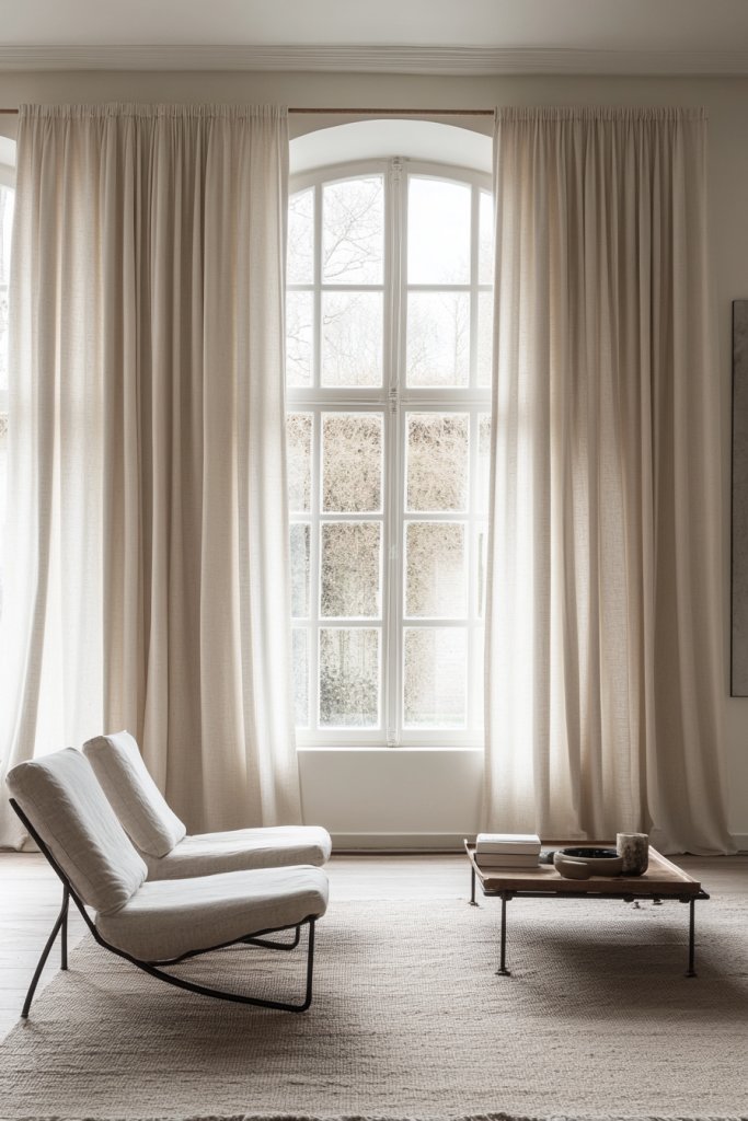 Choose neutral shades to blend seamlessly with your walls, or go for muted colors to add a gentle pop. For small windows, narrow curtains in a single panel work best; larger windows can handle double panels. During different seasons, layer with blackout curtains for winter or sheer fabrics for summer. Keep the hardware minimal and unobtrusive.