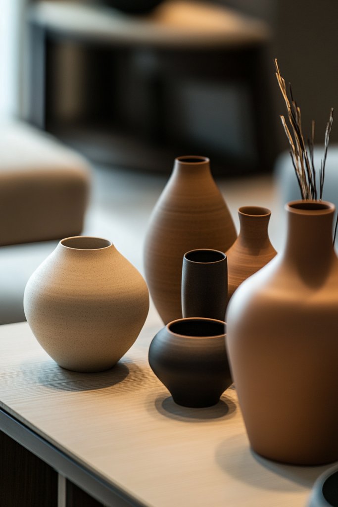 Imagine a sleek ceramic vase with a matte finish perched on a side table, holding a single dried branch or a textured arrangement. Nearby, sculptural objects in metal or wood add depth and contrast. The minimalist design emphasizes clean lines and understated beauty, creating a curated, gallery-like vibe. The surfaces feel intentional and stylish.