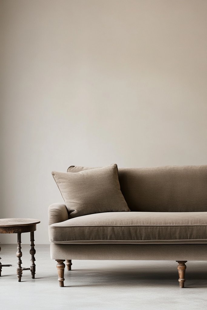 Visualize a sofa in a neutral fabric with slim, tapered wooden legs that lift it slightly off the floor. The minimalist silhouette showcases clean lines and a sleek profile, creating a sense of spaciousness. Soft cushions and a textured throw add comfort, while the exposed wood adds warmth. The overall look is effortlessly chic and modern.
