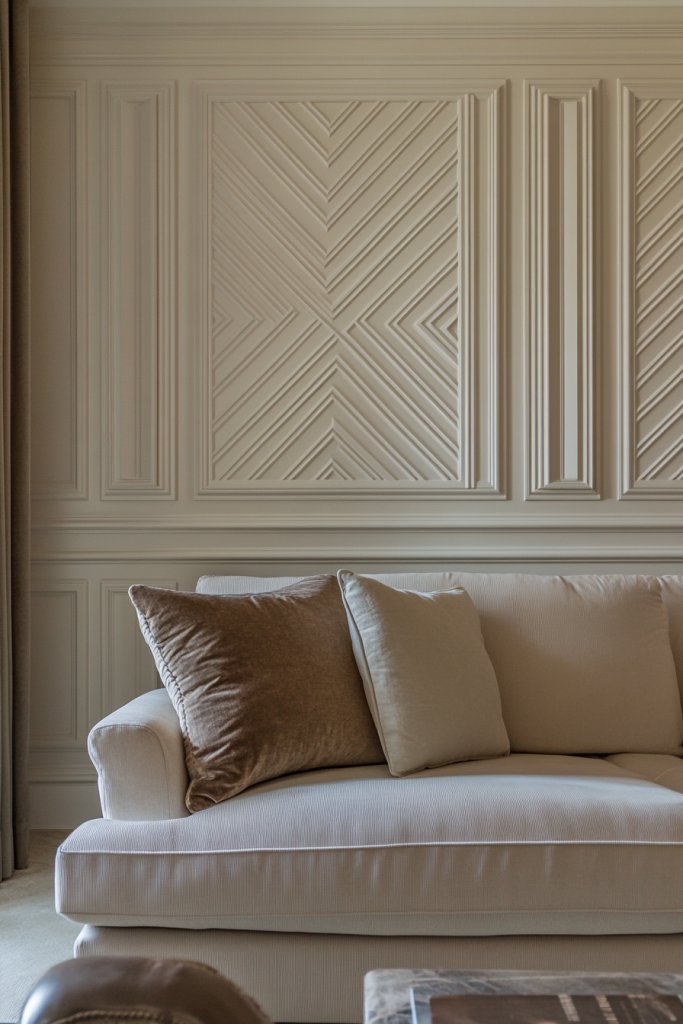 Add decorative molding or trim to frame the textured panels, emphasizing their depth. Incorporate complementary textiles or accessories around the feature wall. Use lighting accents like wall sconces or uplights to highlight textures. Personal touches like monograms or small art pieces can be integrated subtly.