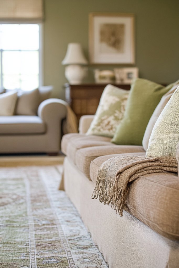 Imagine walls in warm terracotta with furniture in olive green and soft browns. Textiles in muted shades—like a dusty rose throw or a beige rug—add layers of depth. Natural materials like wood and leather complement the palette, creating a warm, inviting space. The overall look is understated yet rich in personality.