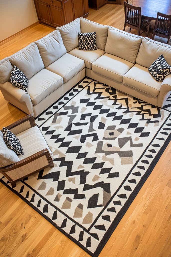 Imagine stepping into a room where a bold, geometric-patterned rug in muted tones like taupe and charcoal lays beneath a seating arrangement. The sharp lines and shapes create visual interest, guiding the eye around the space. The rug’s texture feels soft underfoot, balancing modern patterns with comfort. This piece transforms a plain floor into a statement element that ties everything together.