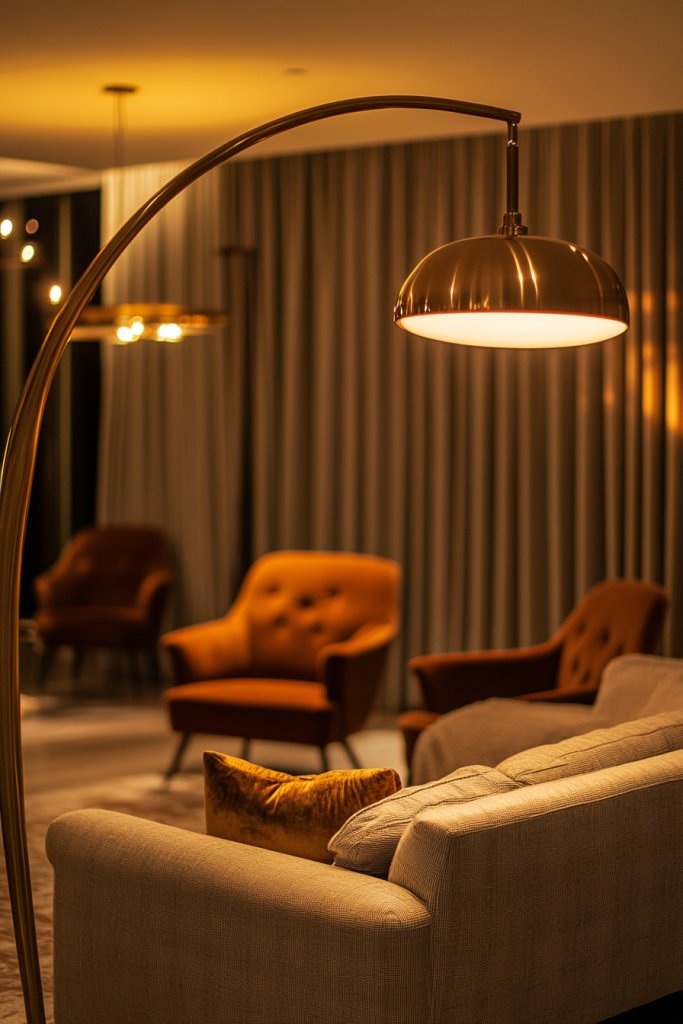 Ever feel like your living room lacks soul or warmth? Good lighting can change everything, transforming a dull space into a cozy haven. Retro-inspired fixtures like arc floor lamps or pendant lights with brass or matte black finishes add vintage charm and glow. They set the mood and make your space inviting for any gathering.
