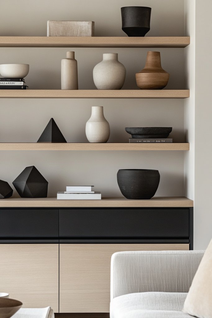 Imagine a set of slim, floating wood shelves mounted on a neutral wall. They hold a few carefully selected items: a ceramic bowl, a textured box, or a geometric sculpture. The open design maintains visual lightness, preventing the room from feeling crowded. Soft lighting highlights the shelves’ contents, adding warmth and depth.