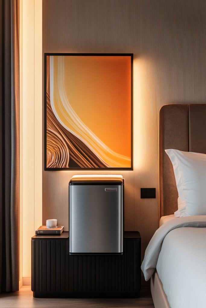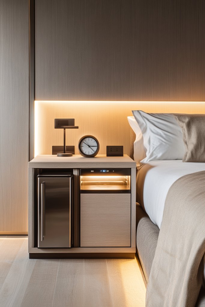 Imagine a modern nightstand with clean lines, crafted from warm wood or matte laminate. The mini fridge is seamlessly integrated into its base, hidden behind a smooth panel that opens with a gentle push. Soft LED lighting inside illuminates your essentials, while a plush throw drapes over the side for cozy vibes. It’s like blending furniture with convenience in perfect harmony.